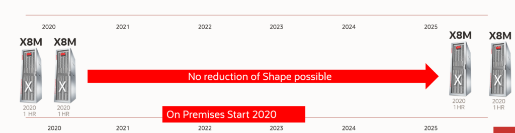 CPU and data volumes would easily fit into a Quarter Rack. So I asked: “Why do you want a Half Rack?” Their answer was familiar. In the past, they had bought a Half Rack, migrated workloads, reached a consolidated steady state, and later saw usage drop as applications were decommissioned or moved elsewhere. Sure, a Quarter Rack would work today, but they didn’t know what future demand would look like. Buying bigger up front simplified budgeting and avoided mid commitment procurement and delivery processes. This is the classic on-premises mindset: estimate the peak size for it and stay on the safe side. Expanding later creates work and cost. Depreciation schedules for staggered hardware purchases complicate long-term financials. If we visualize their past five years on-prem, it likely looked like this: