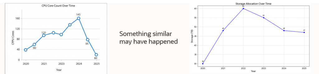 Some time ago, right after the launch of DB@AWS, a customer asked me to compare the cost of a Exadata Half Rack on-premises with a Cloud deployment. As always, I asked for real usage data from the on-prem systems they planned to migrate. What they sent back gave me real food for thought about what flexibility in the cloud truly means for database infrastructure. We all know the “Black Friday” stories: extra compute needed to handle a short-term surge. But this conversation made me reflect on a more everyday pattern: how demand grows, stabilizes, and sometimes shrinks over years, and how that should change our sizing decisions. The data surprised me.